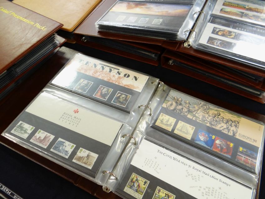 TWELVE BINDERS OF ROYAL MAIL PRESENTATIONS PACKS (eleven dark brown, one tan) (12)the date range is from 1986 - 2018
