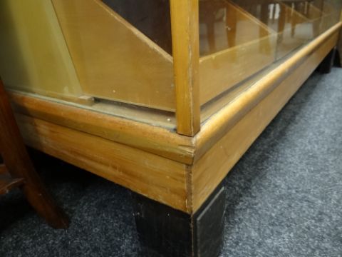 MID-CENTURY GLASS & LIGHTWOOD RETAILERS CABINET having a bank of sixteen tray-drawers, each with metallic handles, the top with metal measuring rule, ebonized feet, 153cms wide, 59cms deep, 92cms high