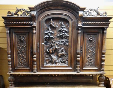 Condition Report: central panel hunter's lance missing, some minor worm holes, base slightly faded, cornice and base with chips and dints.