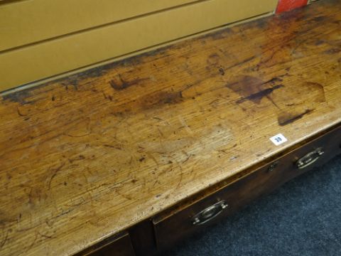 18TH CENTURY ELM OAK DRESSER BASE, three deep frieze drawers and carved apron, square section legs, 204 x 44 x 75cms