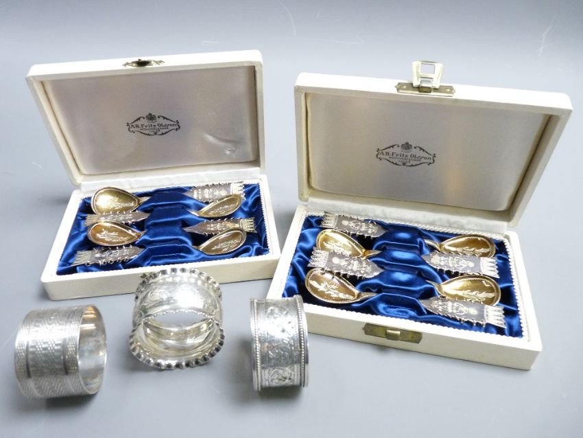 SMALL SILVER: A QUANTITY including two cased sets of four Norwegian spoons by F Olsson, a London 1890 table spoon and three napkin rings with Birmingham hallmarks, various dates, 7.3 troy ounces gross, 229g