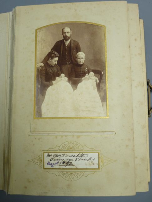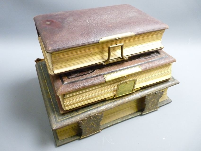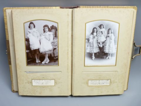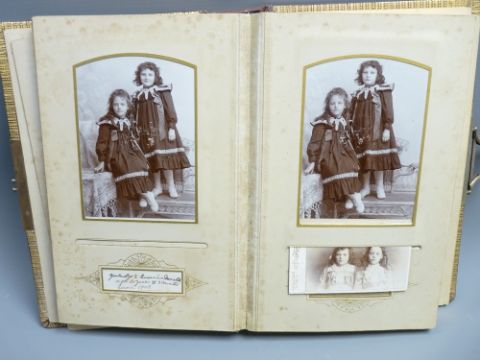 TWO VICTORIAN PHOTOGRAPH ALBUMS & A FAMILY BIBLE 140 plus portrait images to one album, the other having single page portraits depicting the twins Gwladys and Eunice, the first image being at 5 weeks old, dated 1892 through to the age of 16 years, the family Bible in Welsh, Llandudno family, with decorative brass clasps