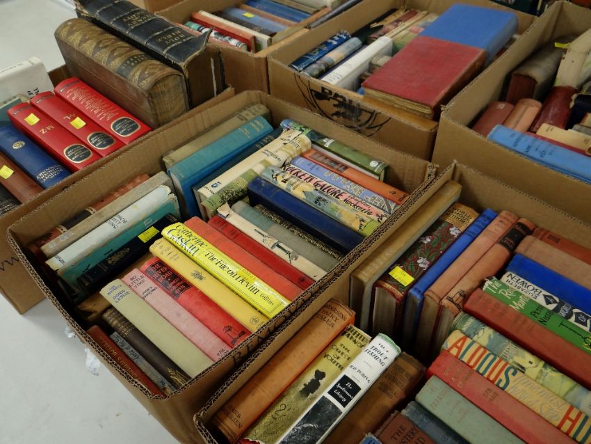 ASSORTED BOOKS mainly novels and a Henry and Scott Holy Bible (1858), Welsh Language Pilgrim's Progress (5 boxes)