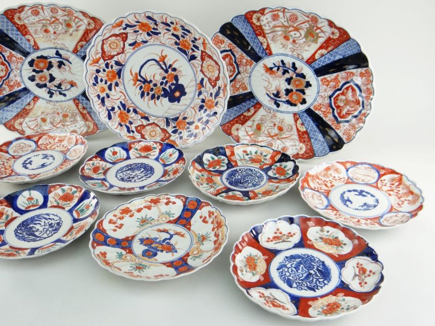 ELEVEN JAPANESE IMARI CHARGERS including two good oval fanned, 37cms wide (11)