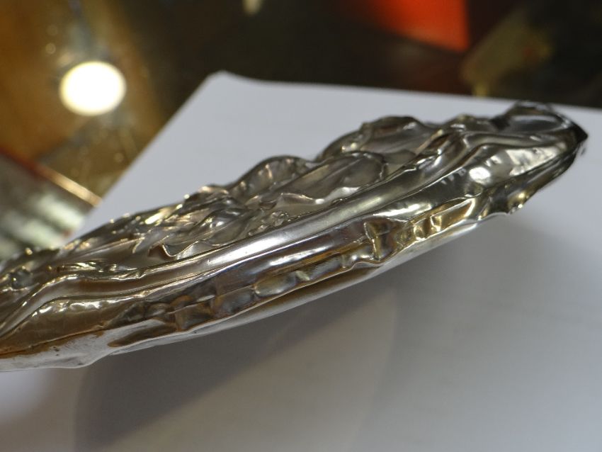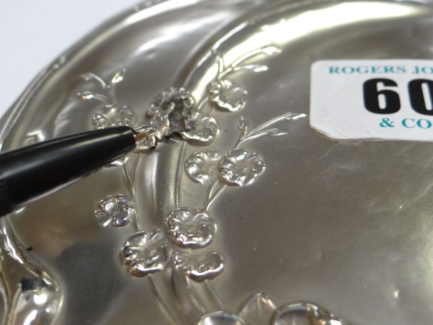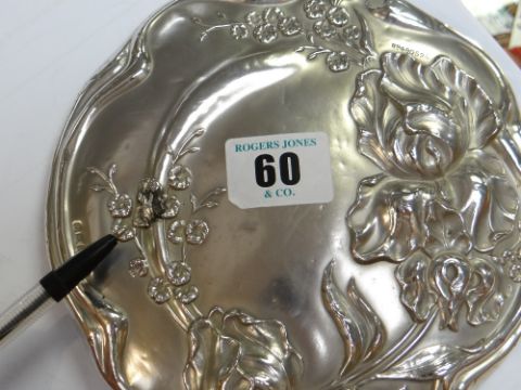 ART NOUVEAU SILVER HAND MIRROR with raised floral decoration, London 1906 Condition Report: small area of loss.There are a few other marks and dings around the edges, looks like it might have been dropped at some point and on the other side to the mirror there is wear to the high-points of silver possibly from over polishing.