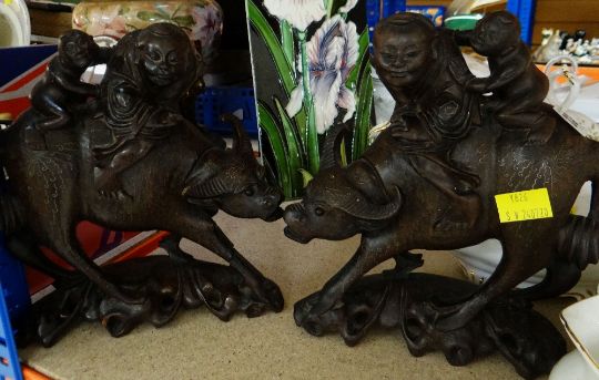 PAIR OF ORIENTAL INLAID HARDWOOD BUFFALO MODELS WITH RIDERS (2)