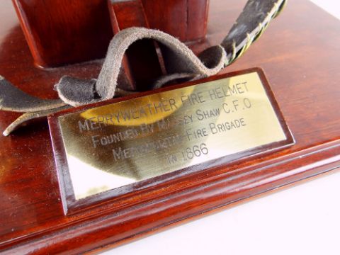 ANTIQUE BRASS MERRYWEATHER-TYPE FIRE BRIGADE HELMET on stand with plaque