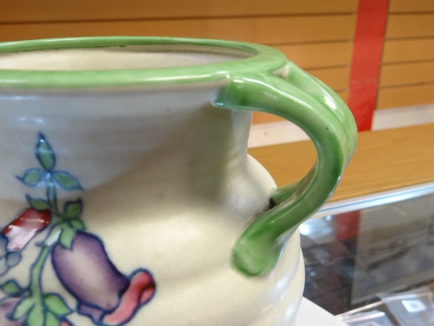 CROWN DUCAL CHARLOTTE RHEAD JUG of ribbed form with small upper section loop handle, in a floral design, 20cms high