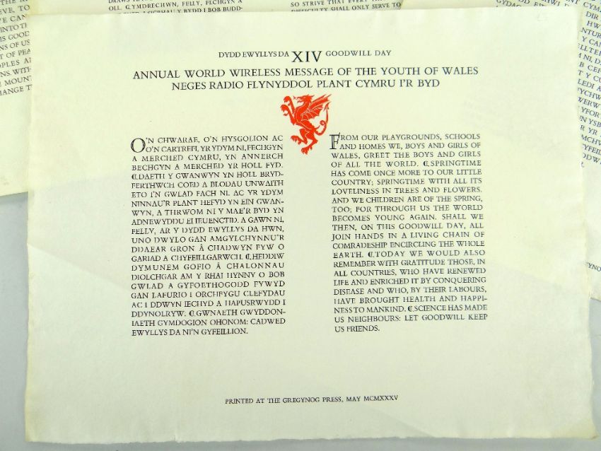 SEVEN BROADSHEETS OF THE ANNUAL WIRELESS MESSAGE OF THE YOUTH OF WALES Gregynog Press 1932-1938 (7)