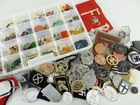 COLLECTION OF GERMAN MEDALS & MILITARIA believed separated into reproduction and authentic together with assorted German WHW (Winter Help Work) Donation Badges and booklets, similar USSR