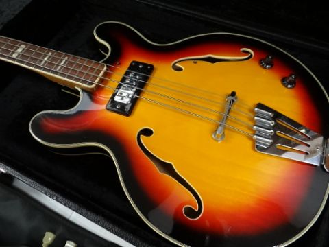 EPIPHONE ELECTRIC GUITAR & CASE Japanese made with sunburst finish, mother-of-pearl inlay and chrome, 114cms longthere is no model number on the guitar just the word 'Japan' stamped on a metal plate on the reverse.