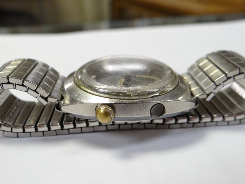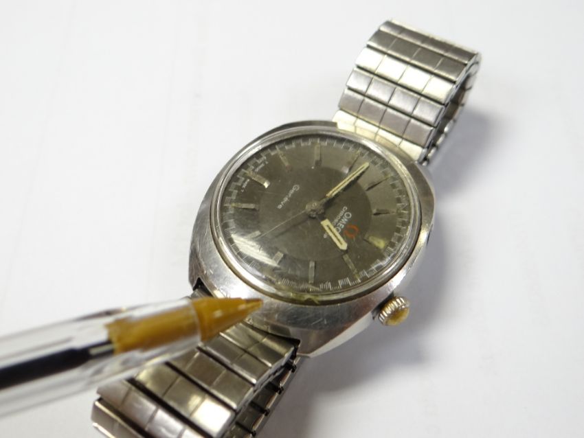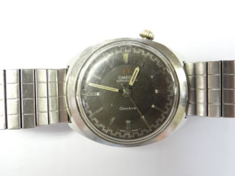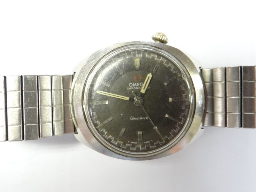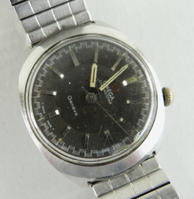 OMEGA CHRONOSTOP GENEVE 'DRIVER' WRISTWATCH, the charcoal dial with baton markers having expanding Excalibur bracelet, with red Omega wallet containing Omega International Guarantee booklet 'You and your Omega' booklet and bill of sale from Star Jewellers Porthcawl dated 12.11.1970.