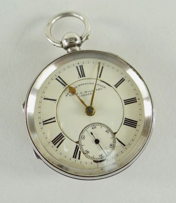 SILVER 'SPECIAL ENGLISH LEVER' POCKET WATCH, the movement marked 'Chas O. Williams Cardiff' number 564735, the inside back cover engraved William Lloyd, Chester hallmarksThe watch has an engraved date of 1918.Unfortunately I cannot wind it to see if it is working, there is no key.There is some slight damage to the face at the 6 o’clock mark