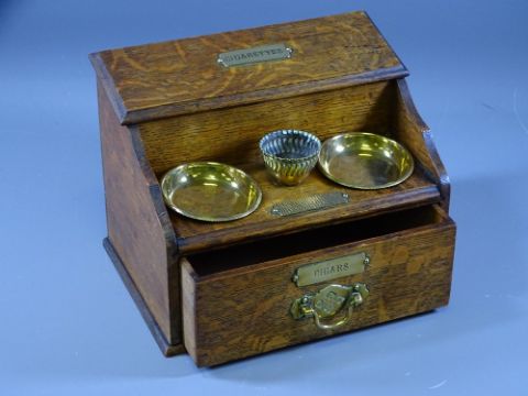 SMOKER'S CABINET, attractively made with brass fittings, brass handle to the drawer and 'cigarette and cigar labels in brass', a circular beadwork topped tapestry footstool for restoration and a small oak lidded cigarette box with twin compartments and three carved front symbols of a harp, a leek and a goat