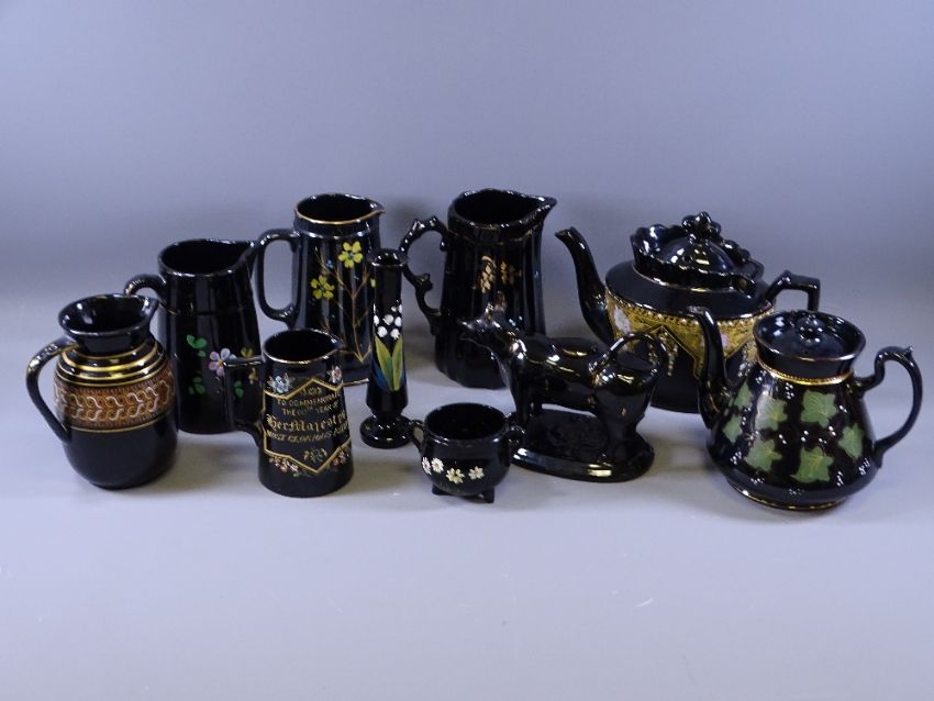 BLACK LUSTRE, a parcel of 9 teaware and other pieces and a black Jackfield oval based cow creamer