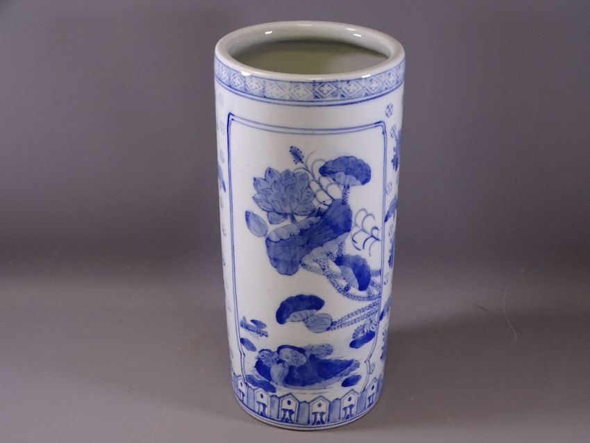 20TH CENTURY BLUE & WHITE POTTERY UMBRELLA STAND with floral and cloud decoration, 38cms H