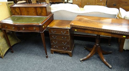 REPRODUCTION GEORGIAN-STYLE MAHOGANY BONHER DU JOUR, 92cms wide, and similar reproduction Georgian-style card table and small chest (3)