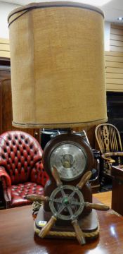 UNUSUAL NAUTICAL TABLE LIGHT the base incorporating miniature ship's wheel and Carrington aneroid barometer, 58cms high with shade