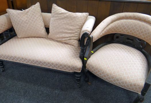 LATE VICTORIAN EBONISED CANAPE SOFA, 118cms wide and a tub chair similar (2)