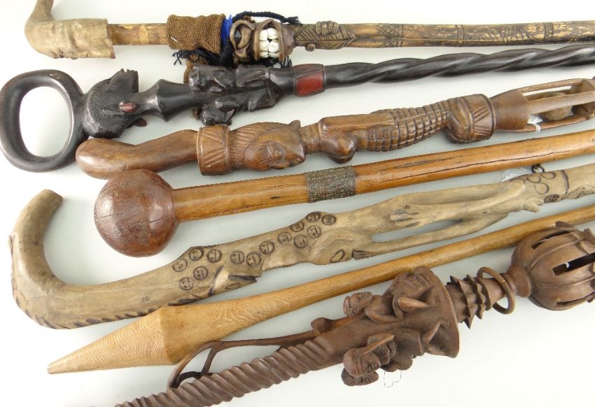 SOUTH AFRICAN PRESTIGE STAFFS OR CANES & TWO CLUBS (7)The Late Neville Kingston Collection of Tribal ArtRogers Jones are delighted to offer the selected objects from the collection of the late Neville Kingston, formerly of London.Philip Keith who is a regional valuer with the Welsh auction house is one of the UK’s foremost authorities on ethnographic antiques and the co-author of ‘Tribal Art – The Essential World Guide’. This is the first tribal collection that has been entered for auction at Rogers Jones & Co since Philip joined the firm at the beginning of the year. The collection has been split into two auctions with the more important items featuring in the September Selections & Collections auction.The collection is huge in its variety of ethnographic objects from Africa, South Asia, South America and the Pacific attesting to Neville’s interest in the material culture from all regions of the non-western world.Items of note include two rare and beautiful bows from the Andaman Islands in the Indian Ocean together with two bundles of carved and coloured arrows from the Highlands of Papua New Guinea, as well as intricately bound, delicate Amazonian reed arrows contained in two lightweight quivers.The standout Polynesian lot is an intricately carved ritual paddle from the Austral Islands. These paddles were carved using steel tools traded with European sailors up until the 1840s and are classic expressions of early cross-cultural exchange.For the decorators market, there are two large New Guinea war shields carved with stylised curvilinear designs in bold colours, an enigmatic and beautifully weathered temple roof element from Cambodia and an amazing purple feathered headdress from the Bamileke people of Cameroon, traditionally worn with a beaded cloth elephant effigy costume.The standout African sculpture is a wonderfully stylised iagalagana figure from the Mumuye people of the Benue river region of Nigeria. These etiolated figures with their wrap around arms and of rounded form are the height of fashion amongst collectors and sure to raise international interest.The collection has been entered by his daughter who said:"Neville Kingston was a noted collector of Central Asian textiles and carpets. He combined this with his full time job as a veterinary surgeon, specialising in pigs, a skill which took him around the world from his East Yorkshire base. However, in 2008, his attention was caught by some central and west African ethnographica while he was waiting on the phone to bid for a textile in an auction in Salisbury.The auctioneer persuaded him to bid on the lots “just to start the bidding” and he ended up with his first group of African tribal art. From there began a fascination with this art, with Neville building up a library of books and subscriptions to journals and auction catalogues, in order to learn more about this art form which is under appreciated in the UK. He became a frequent visitor at Parcours in Paris where the enthusiasm was infectious. Although Neville’s first love was always carpets and textiles, he was fascinated by this other form of tribal art and started buying whatever he could, mainly at local auctions. As a newcomer to this world, he bought whatever he could as a means to studying and extending his knowledge."
