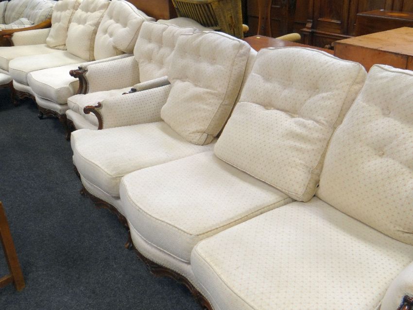 FRENCH LOUIS XV-STYLE WALNUT SALON SUITE comprising two three-seater sofas and a matching armchair and matching foot stool (4)