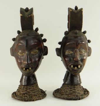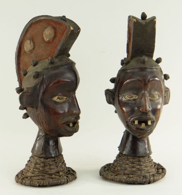 PAIR OF EKOI DANCE HEADDRESSES with arched crests and rattan bases, 39cms high (2)