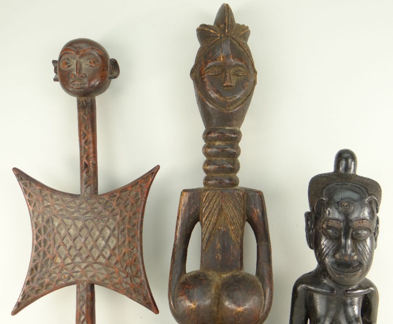 MENDE STANDING FIGURE 66cms high; Nyamwezi stylised figure, 59cms high and Kuba maternity figure, 43cms high (3)