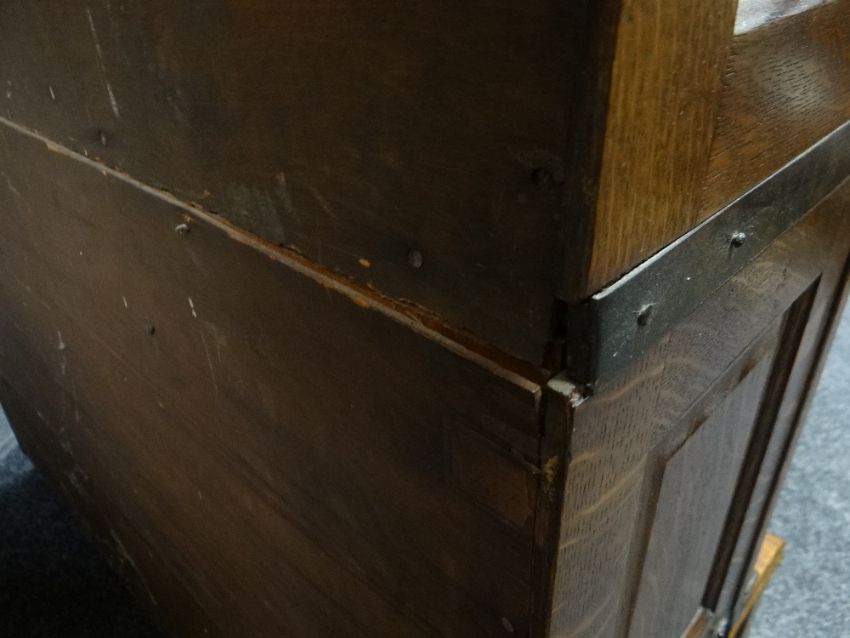 GLOBE-WERNICKE OAK SECTIONAL BOOKCASE of three-tiers on drawer base, 90cms widethe height is 130cmsthe depth at the top is 30cms, at the bottom it is 38cmsNo there is no damage to any of the glass, it’s just the reflection.Unfortunately the key is missing so the doors wont lock.The drawer on the base has a damaged handle but is present, it just needs to be bent back into the holders.It all feels fine, structurally solid, no worm.There is slight damage to the back, there is a small piece of wood missing and in one corner the back is starting to come off, just needs to re-tacking.Very light general wear.