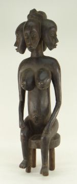 SENUFO SEATED FEMALE FIGURE, carved with five faces, 65cms high