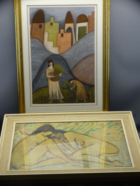 CHRISTA DE KOCK pastel - study of figures gathering crops, 58 x 39cms and OTTO MUELLER mid-century print - two nudes, 48.5 x 64.5cms