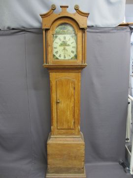 JOHN PARRY OF PENCARREG PINE LONGCASE CLOCK, arched top painted dial before a thirty hour single weight pendulum driven bell strike movement, pendulum and weight included, single glazed door hooded top with broken pediment, arched top trunk door on a tall trunk base, 211cms H, 56cms W maximum