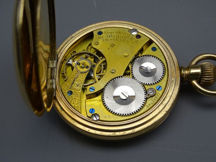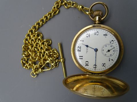 WALTHAM FULL HUNTER POCKET WATCH and Albert chain with T-bar, the case rolled gold, the Albert probably modern but antique style in gilt metal, appears in running working order