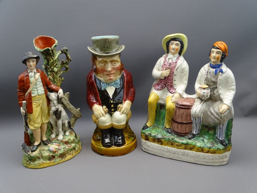 SARREGUEMINES TOBY JUG and two Staffordshire figurines including an early spillholder of a huntsman with dog and a seated pair of drinking gentleman titled 'Tam O'Shanter' and 'Sooter Johnny', (note - all the letter 'Ns' are incorrectly impressed), 32cms high to all