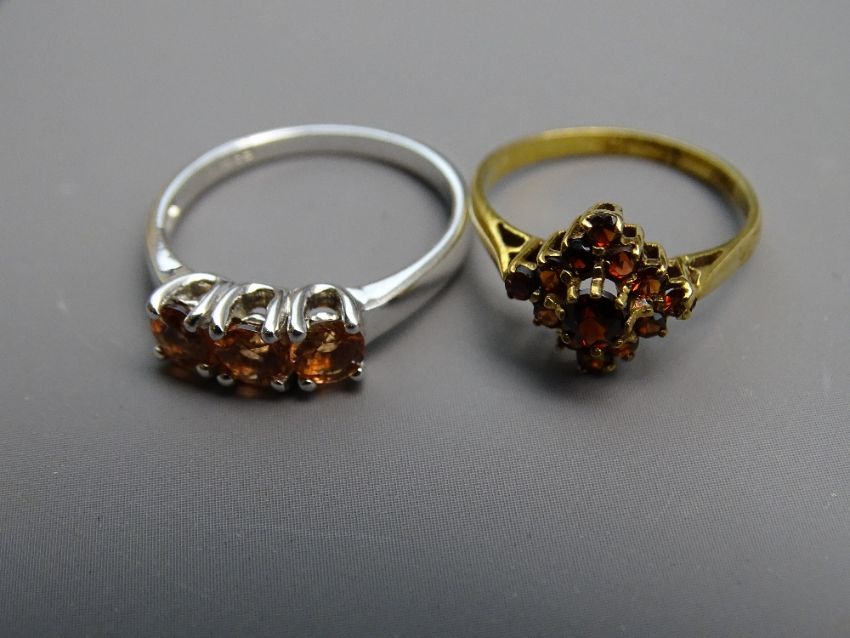 TWO NINE CARAT GOLD RINGS, one triform pink sapphires in white gold setting and band, plus one cluster raised setting of garnets in yellow gold, 3.8grms total