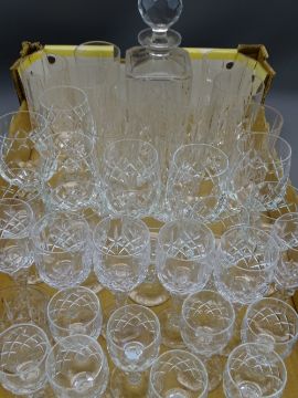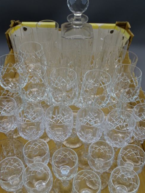 CUT GLASS SQUARE DECANTER & STOPPER with a selection of drinking glassware