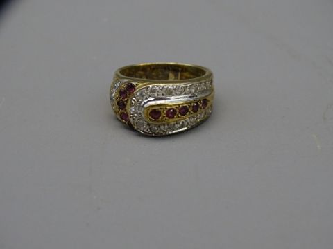 9CT GOLD ART DECO BUCKLE FORM RING with rubies and diamonds, 5.7grms