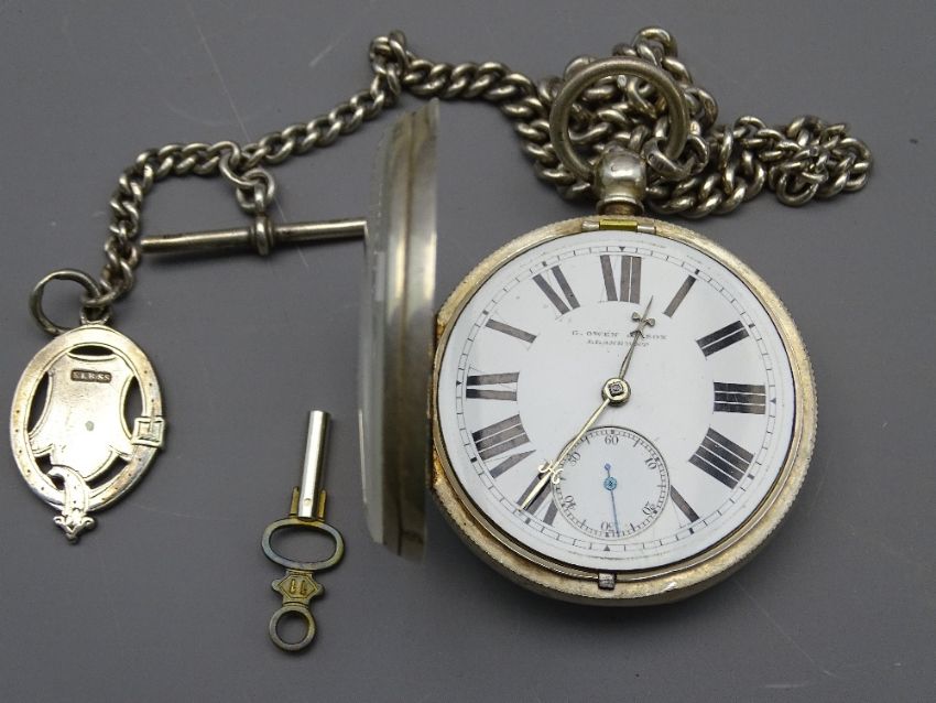 G OWEN & SONS, LLANRWST OPEN FACED SILVER POCKET WATCH and Albert chain with T-bar and fob, key wind movement and white enamel dial set with Roman numerals and subsidiary seconds dial, the case hallmarked Chester 1899, 6.6 troy ozs gross