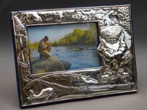 LARGE SILVER PHOTO FRAME showing 'Fisherman', embossed to front and velvet easel back, 1995 London, BSC Ltd, 20cms wide
