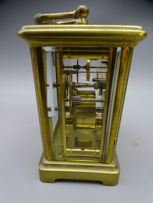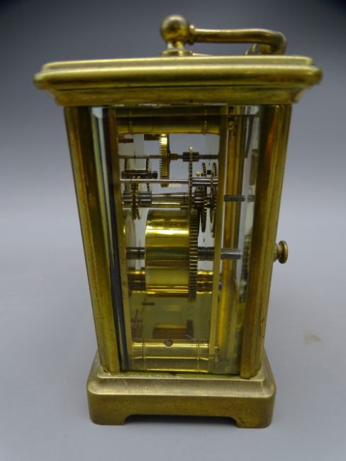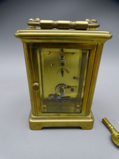 FRENCH BRASS CASED CARRIAGE CLOCK with key, 14cms H handle up