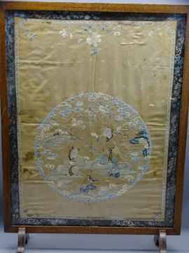 LATE 19th/EARLY 20th CENTURY CHINESE EMBROIDERED SILK PANEL FIRESCREEN, 79cms H, 58.5cms W complete