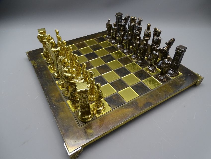 LACQUERED BRASS CHESS BOARD and cast metal bronze and brass effect chess set