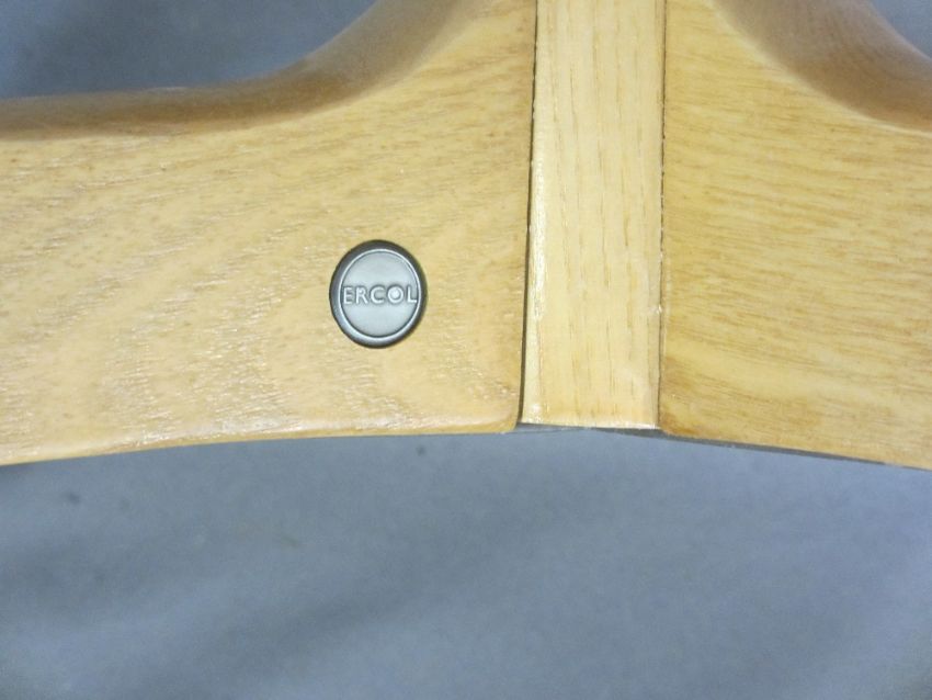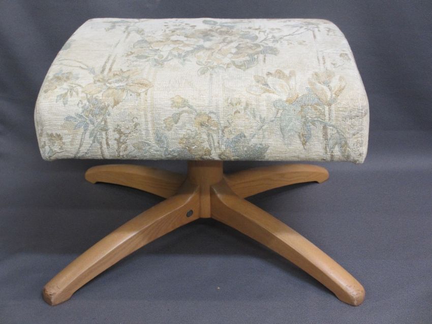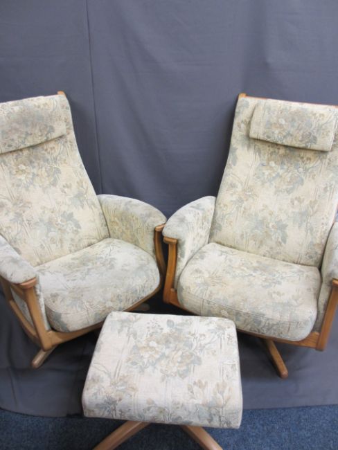 ERCOL LADY'S & GENT'S SWIVEL ARMCHAIRS and matching footstool, 110cms H, 76cms and 81cms W respectively, 52 and 54cms D the seats