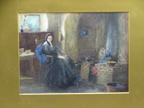 19th CENTURY WATERCOLOUR - study of an elderly woman sat before a fire, unsigned, 24 x 33cms