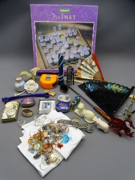 BOXED GLASS 'THREE IN ONE' CHESS SET and a mixed box of collectables