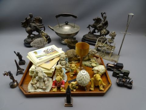 COLLECTABLE ANIMAL/TEDDY FIGURINES and metalware including two spelter knights on horseback