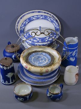 SILVER MOUNTED WEDGWOOD JASPERWARE FOUR PIECE TEASET with other blue and white and decorative tableware