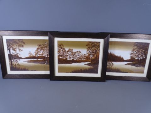 SET OF THREE SEPIA STYLE PRINTS - river/lake scenes, unattributed, 20 x 25cms