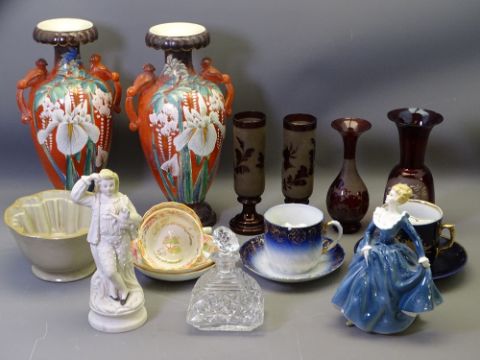 MIXED POTTERY, PORCELAIN & GLASSWARE to include a pair of Satsuma type vases, a Doulton lady figurine 'Fragrance' HN2334, Venetian type ruby red vases, moustache cups and saucers, Victorian figurine ETC