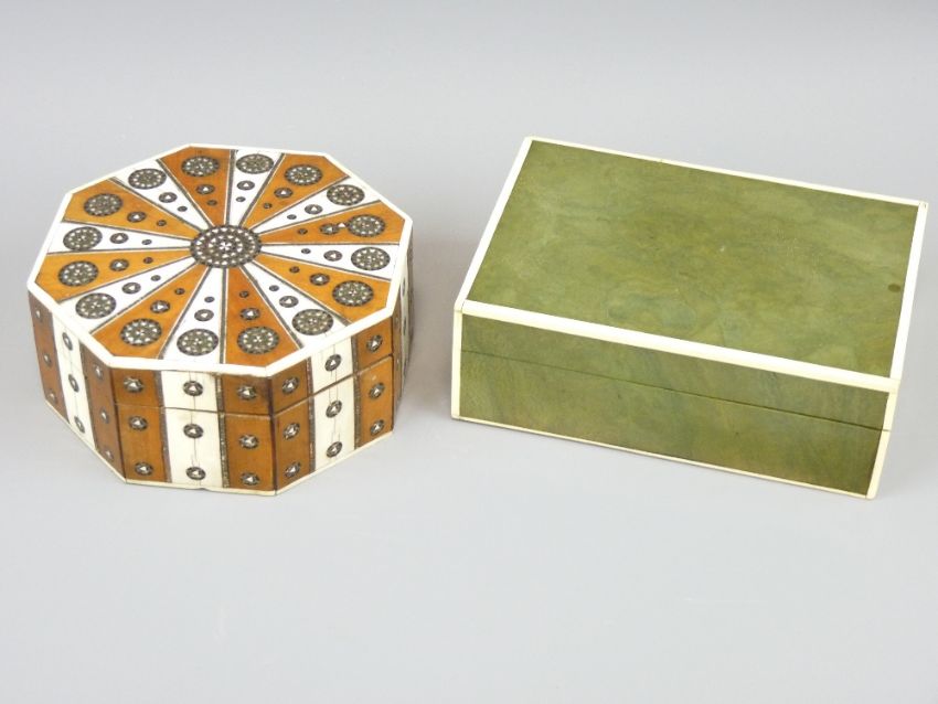 MID 19TH CENTURY VIZAGAPATAM OCTAGONAL BOX with sunburst patterned lid and a green rectangular box