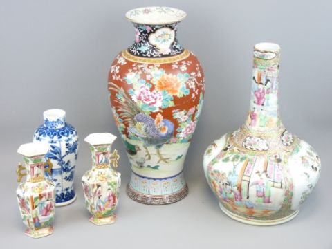 FIVE CHINESE & JAPANESE VASES including a Famille Rose decorated bottle vase, 33cms H, a Japanese baluster vase having cockerel and hen decoration, 37.5cms H, a small pair of Famille Rose segmented vases, 17cms H and a Chinese blue and white baluster vase, 19cms H with four character mark to the base (various damages)